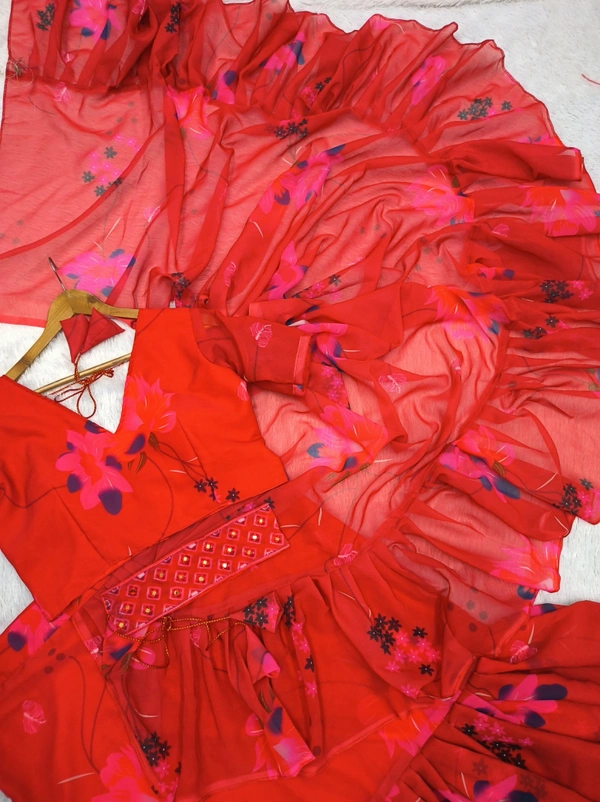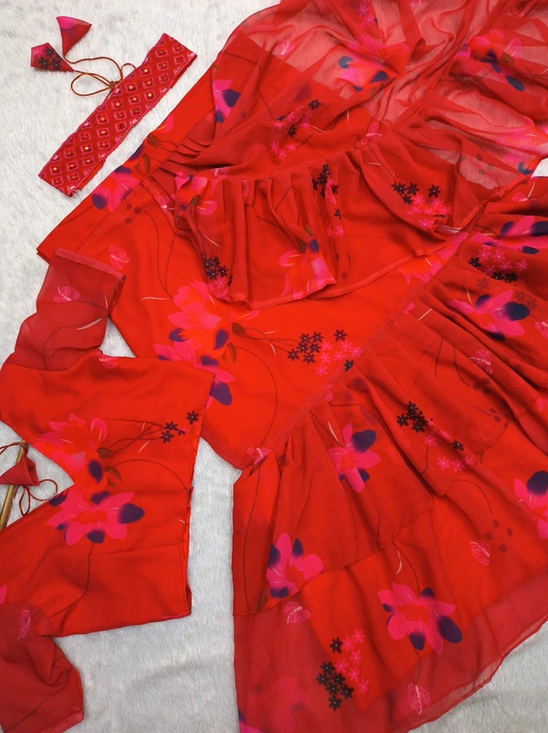*👗Lahenga Saree Faux Georgette With Digital Print & 3 Layer Ruffle With Attached Dupatta*