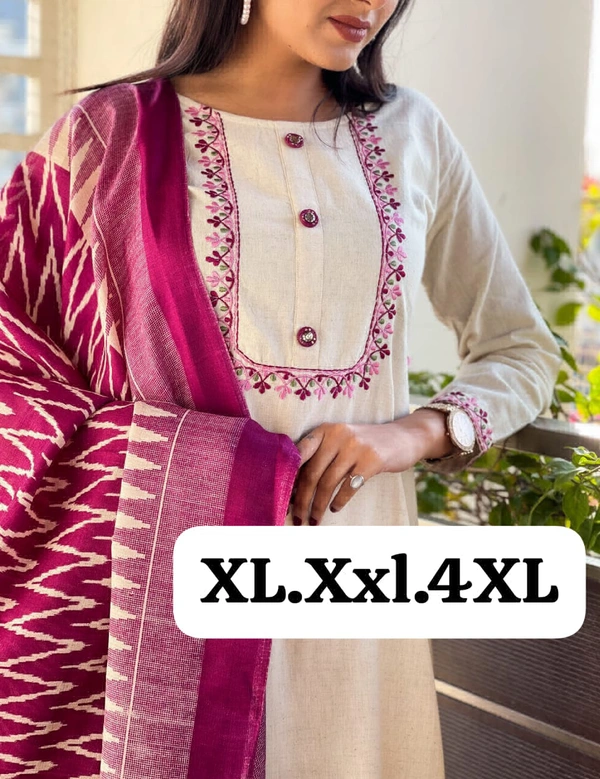 this Modal silk kurta pant and pant silk ikkat print Dupatta set. It comes with handloom cotton straight cut kurta with resham thread embroidery team it with high ankle pants with enclosed button. Style this set with jhumkas and mule heels to complete the look .
